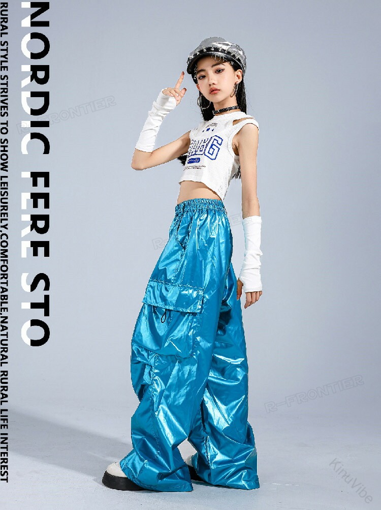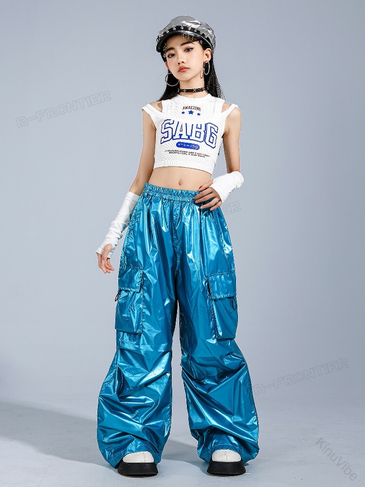 k-pop 衣装 ダンス キッズ へそ出し トップス 女の子 セットアップ 白 キャミソー タンクトップ 青 レザーパンツ カーゴパンツ キッズダンス衣装 ヒップホップ ワイドパンツ かっこいい