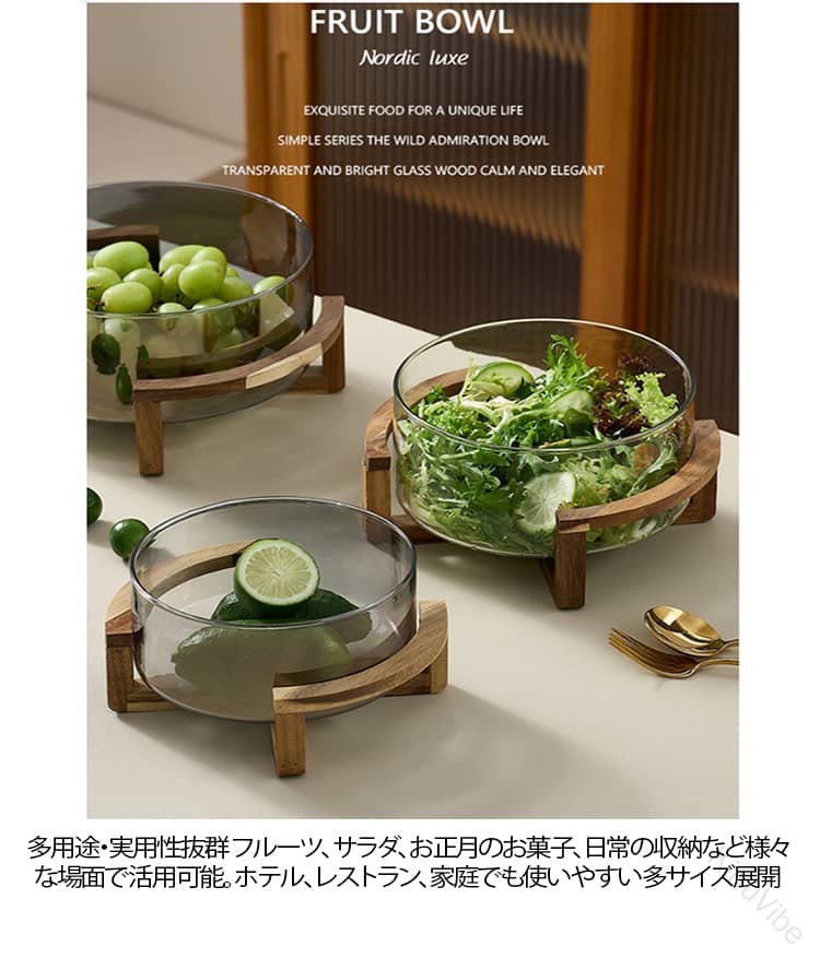 .ガラス 透明 ガラスボウル は フルーツボウル や サラダボウル、シリアルボウル として使える 中鉢 から 大鉢 まで揃い、深皿 タイプ と 木製スタンド付 で おうちカフェ や カフェ風 北欧 インテリア に最適です。シンプル な ナチュラルシリーズ は ホテルフロント や ビュッフェ、家庭用 の受付菓子 など多用途に対応し、おしゃれ なデザインで流量と出単率を高めます。。