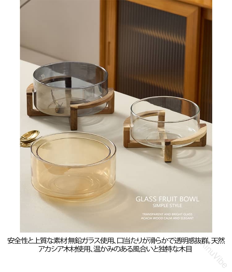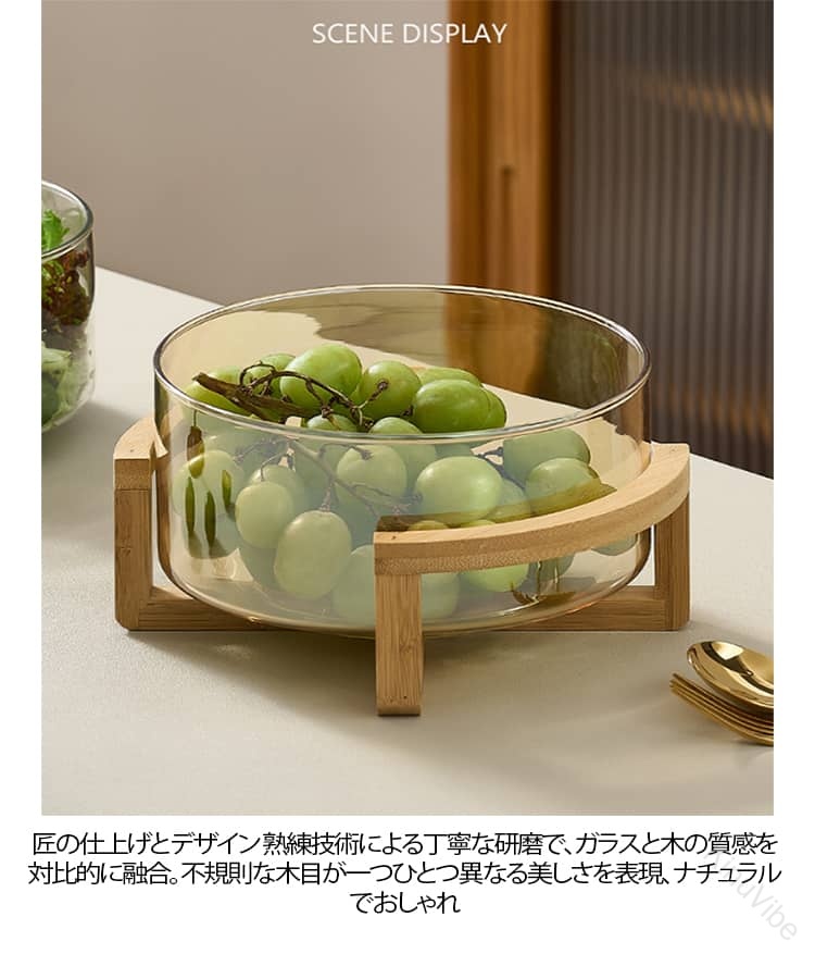 自然の素材と素朴な技法から生まれた、毎日をちょっと特別にする器。安全性と上質な素材無鉛ガラス使用、口当たりが滑らかで透明感抜群天然アカシア木材使用、温かみのある風合いと独特な木目匠の仕上げとデザイン熟練技術による丁寧な研磨で、ガラスと木の質感を対比的に融合不規則な木目が一つひとつ異なる美しさを表現、ナチュラルでおしゃれ多用途・実用性抜群フルーツ、サラダ、お正月のお菓子、日常の収納など様々な場面で活用可能ホテル、レストラン、家庭でも使いやすい多サイズ展開生活に彩りを添えるアイテム機能性とデザイン性を兼ね備え、食卓やインテリアを華やかに演出シンプルながらも存在感があり、贈り物にも最適