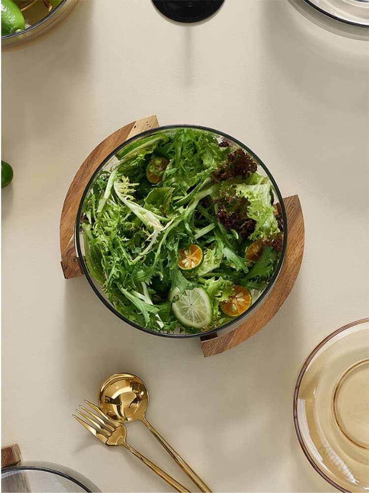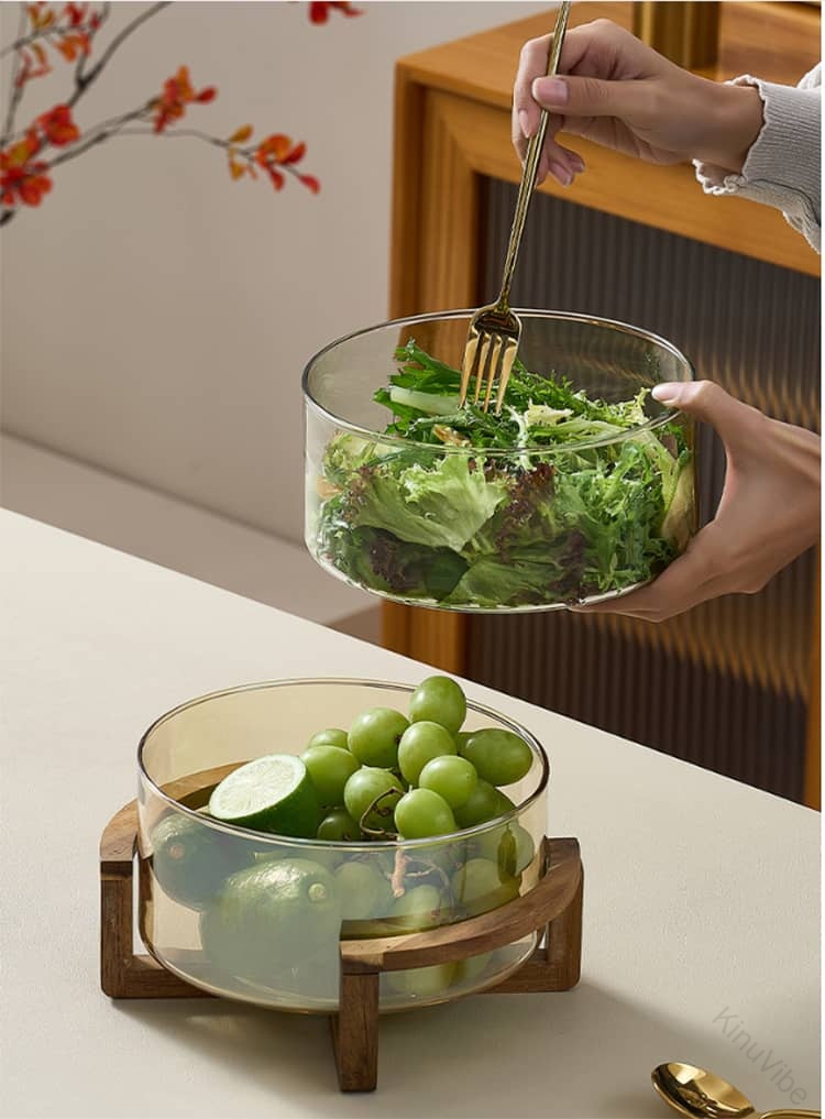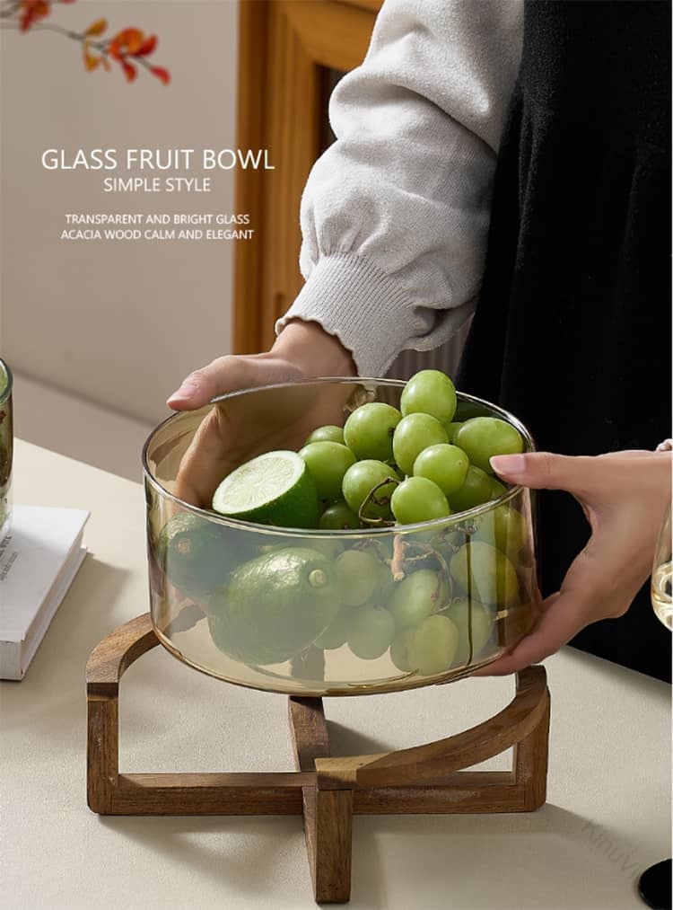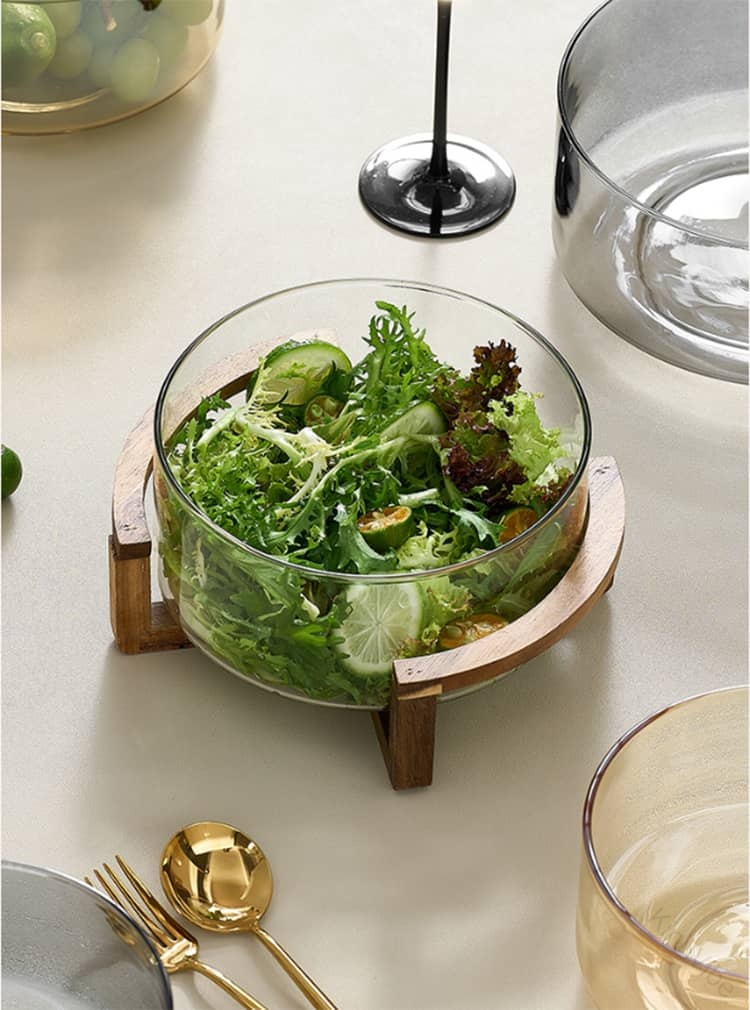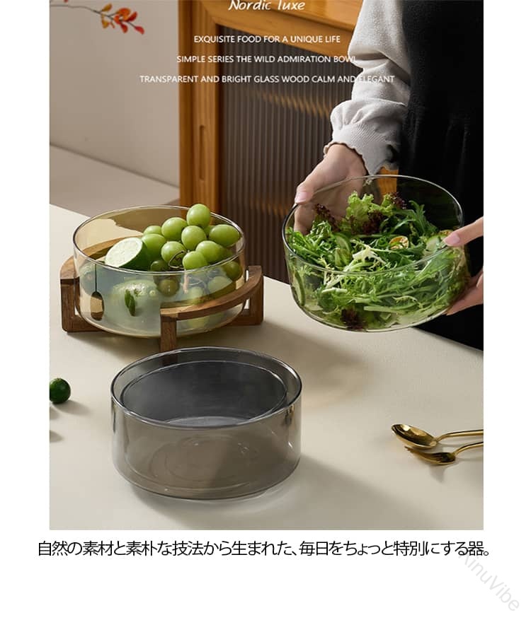 ガラス 透明 ガラスボウル フルーツボウル サラダボウル シリアルボウル 中鉢 大鉢 深皿 木製スタンド付 ナチュラルシリーズ シンプル カフェ風 北欧 ホテルフロント ビュッフェ 家庭 おうちカフェ