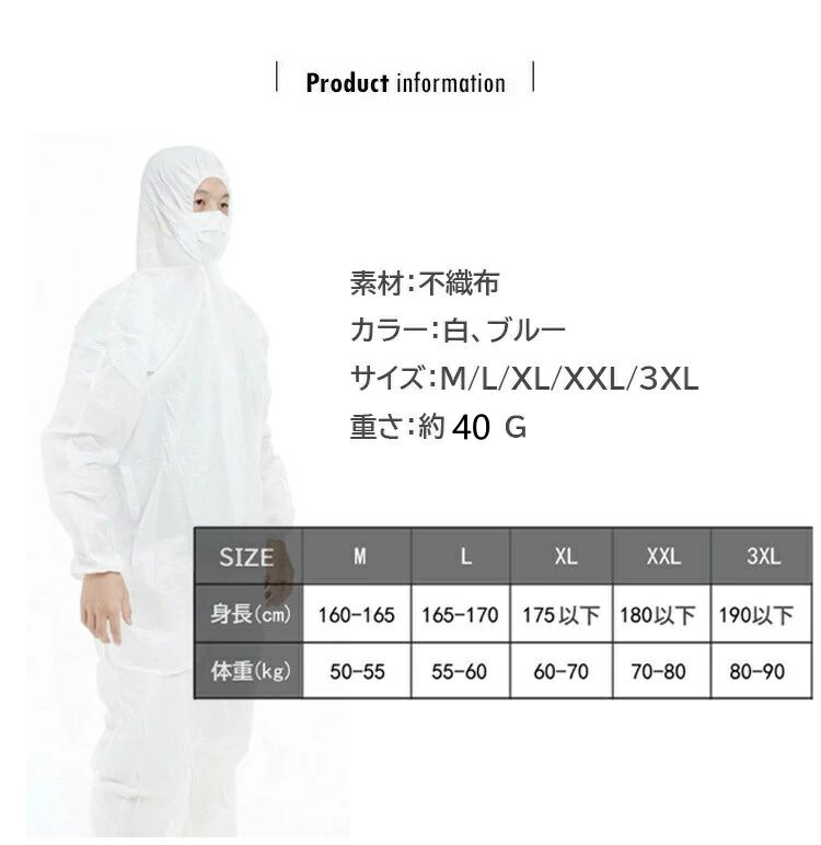 10枚入り 防護服 保護服 使い捨て 作業服 その他 通販 M L XL XXL 3XL 白(PP-通常防塵):3630円税込 ブルー(PP-通常防塵):3630円税込 白(SMS-厚め防水):7150円税込 ブルー(SMS-厚め防水):7150円税込