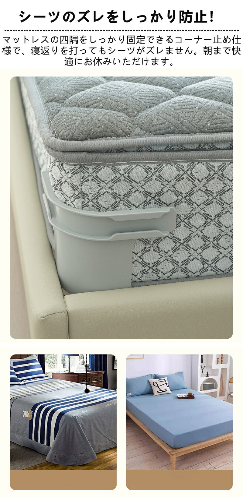 シーツを強力に押さえつつも、見た目に目立ちにくい透明仕様。お部屋のインテリアを邪魔しません。