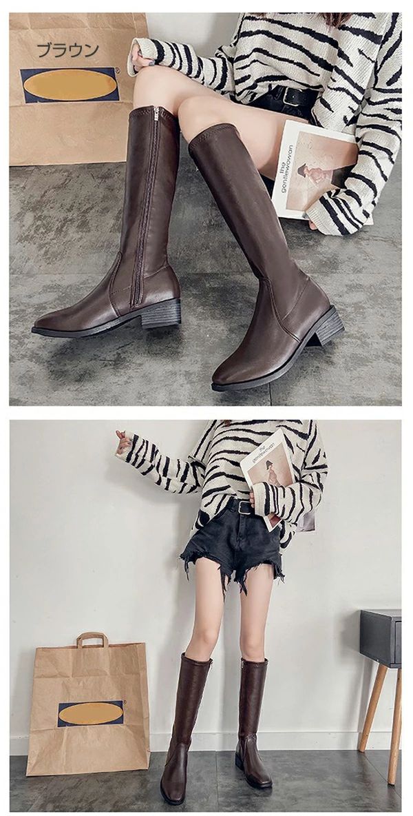 歩き 疲れない ブーツ 靴 膝丈 レディース ローヒール 4cm ニーハイブーツ ロングブーツ 春 チャンキーヒール