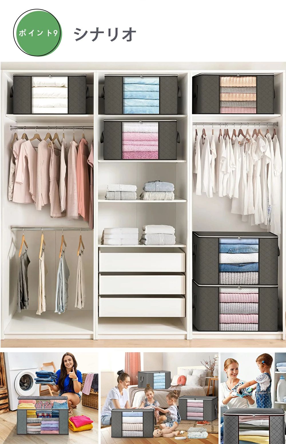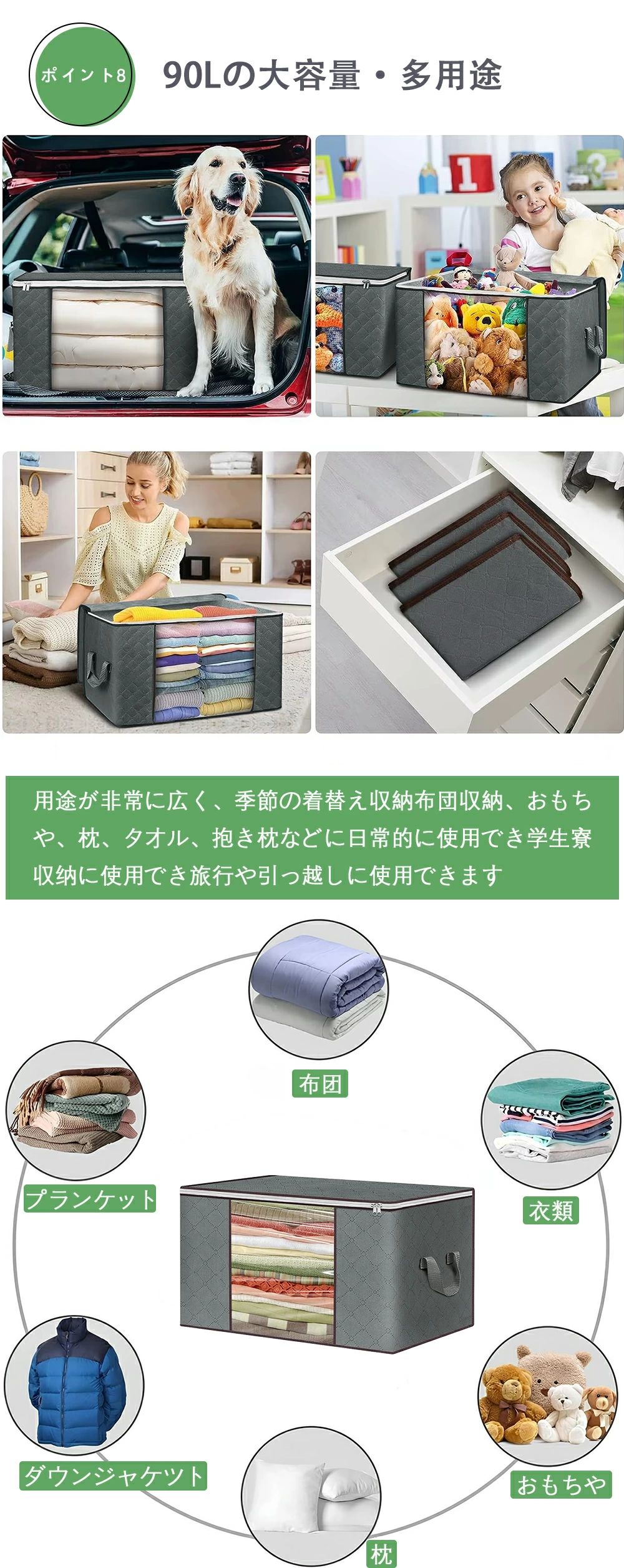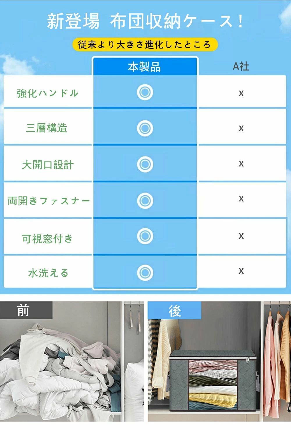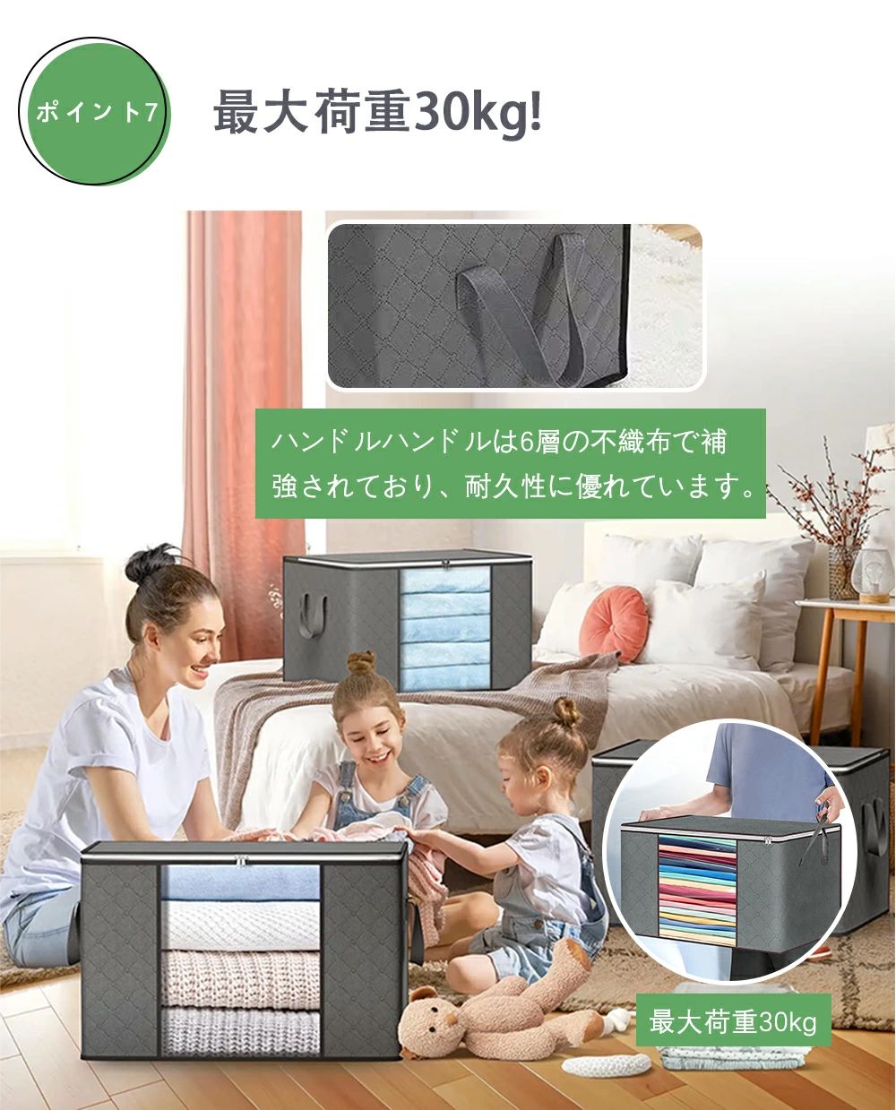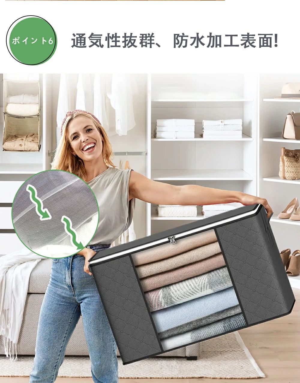 外部の手提げ部分を補強し、耐久性と持ち運びやすさを両立。衣類をたっぷり収納しても、持ち手がしっかりしているので安心して運べます。押し入れやクローゼットからの出し入れはもちろん、引っ越しやシーズンごとの衣替えにも大活躍!