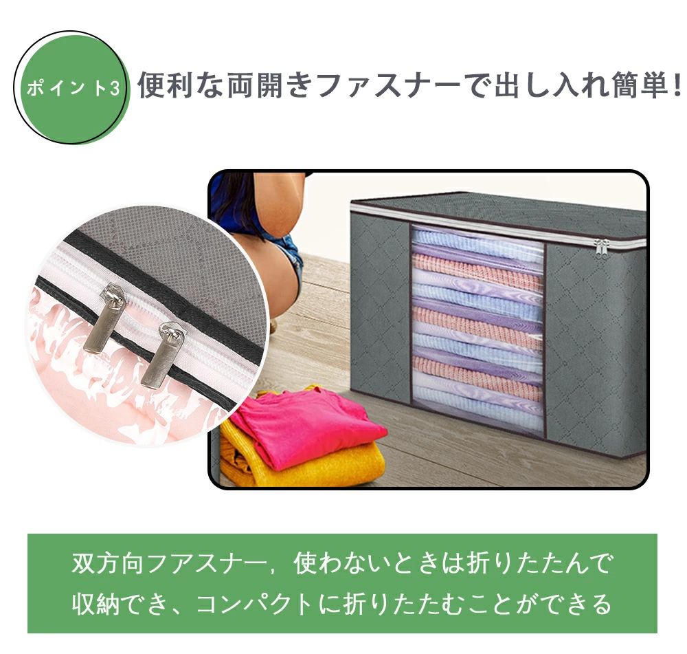 収納袋の開口部にはダブルファスナーを採用し、どちらの方向からでもスムーズに開閉可能。大きく開くワイドオープン設計で、衣類や布団の出し入れがラクラク!必要なものをサッと取り出せるので、毎日の収納がより便利になります。