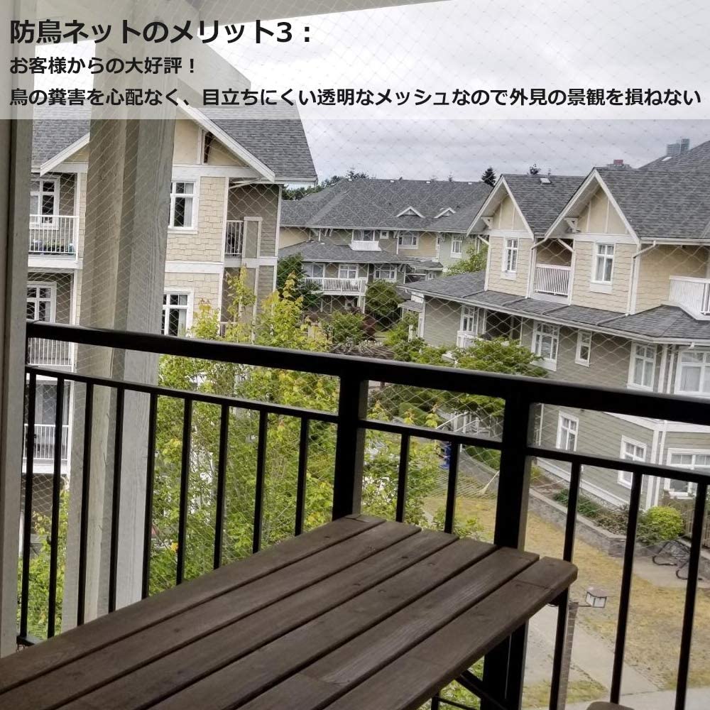 鳥よけネットは透明なテグスを編んでいるため、日光を遮らず、光合成に影響を与えません,使用場所はご自宅のベランダだけでなく、庭、家庭菜園、プランター、花壇、屋根、果樹、農場、田畑、池、などです。ぼうちょうネットは透明色で目立たなくて建物自身の色味に合わせて、外側の景観も損ないません。クリアーな色なので視界が明るく、圧迫感を感じることないです。