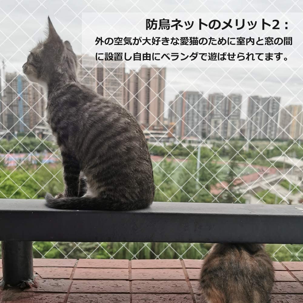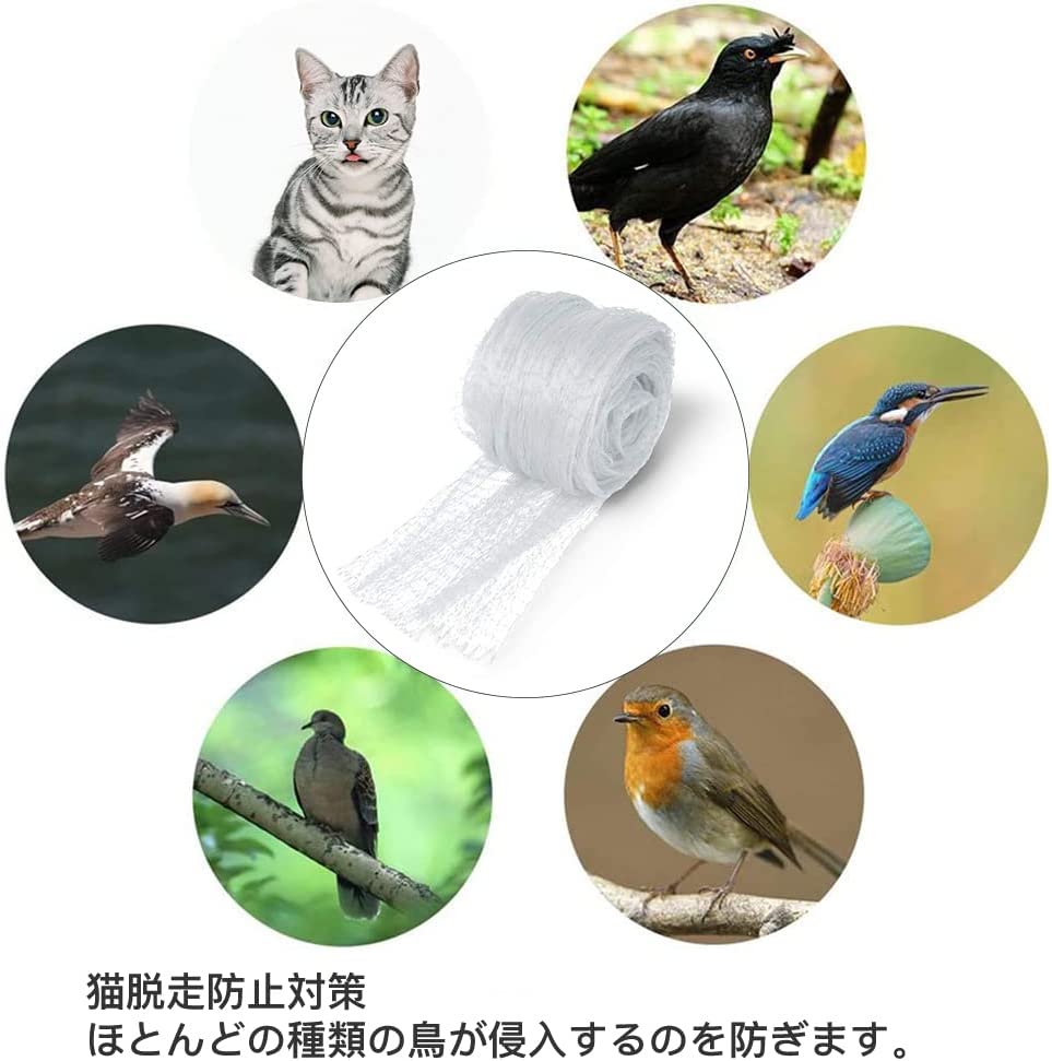 2.5cm細かい目なので最新版鳥避けネットは普通鳩よけネットより、小型な鳥たちの侵入を防ぐことができます。ある程度の硬さと重さがあるので、絡んでしまう恐れもありません。大小の鳥の侵入を防ぐだけでなく、猫が家から脱走することも防止できます。例えばスズメのような小鳥、もちろん鳩、ツバメ、ハト、カラス等害鳥、さらにコウモリなどの小動物にも防ぎます。鳥の糞や作物の被害の心配はありません。