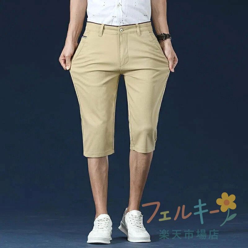 赤 ストレッチパンツ 七分丈 無地 夏 ゴルフ ウェア メンズウェア パンツ 人気 カーキ ブラック ネイビー ライトブルー オフホワイト 28 29 30 31 32 33 34 36 38