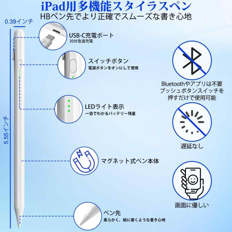 iPad 2025-2018用スタイラスペン、USB-C急速充電ipad ペン、4096傾斜感度ipad ペンシル、i-Pad A16 11 10 9 8 7 6 , 5, Air M3 Mini