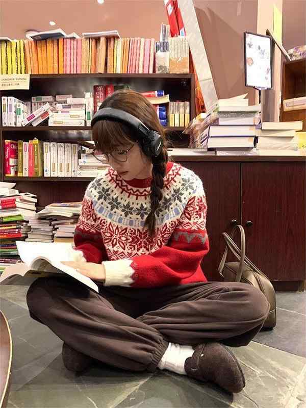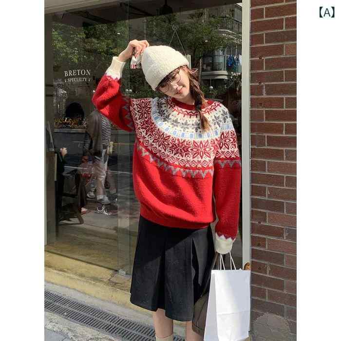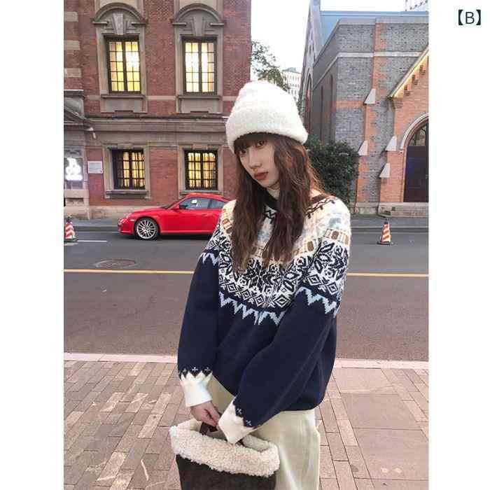 ニット レディース 北欧風 雪柄 クル レディースファッション 豊富な品揃え A:赤 B:青