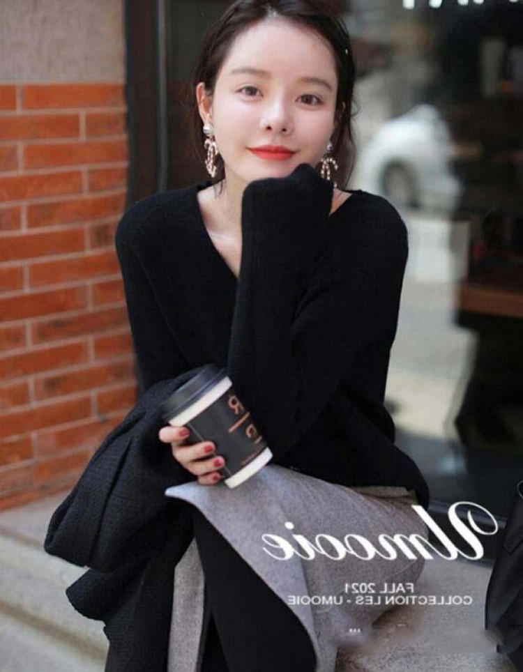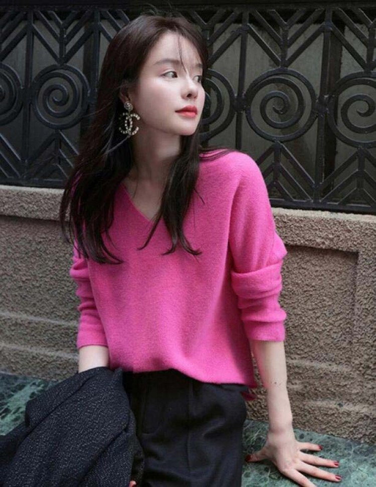 ニットトップス 長袖セーター Vネック ローズピンク ブラック