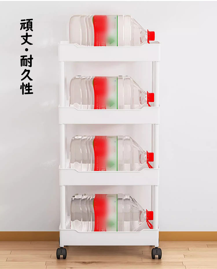 ※移動便利・頑丈:4つのキャスター付きなので360°自由に回転し、床を傷つけることなく手軽にそして静かに動かすことができます。平らでない表面でもぐらぐら揺れませんので安心に使えます。キャスターにはブレーキが付いています。軽くて移動しやすいのがメリットですが、安定性に欠けるのがデメリットなので、安定性を高めるために洗濯洗剤などの重いものを下の層に置くことをおすすめします。