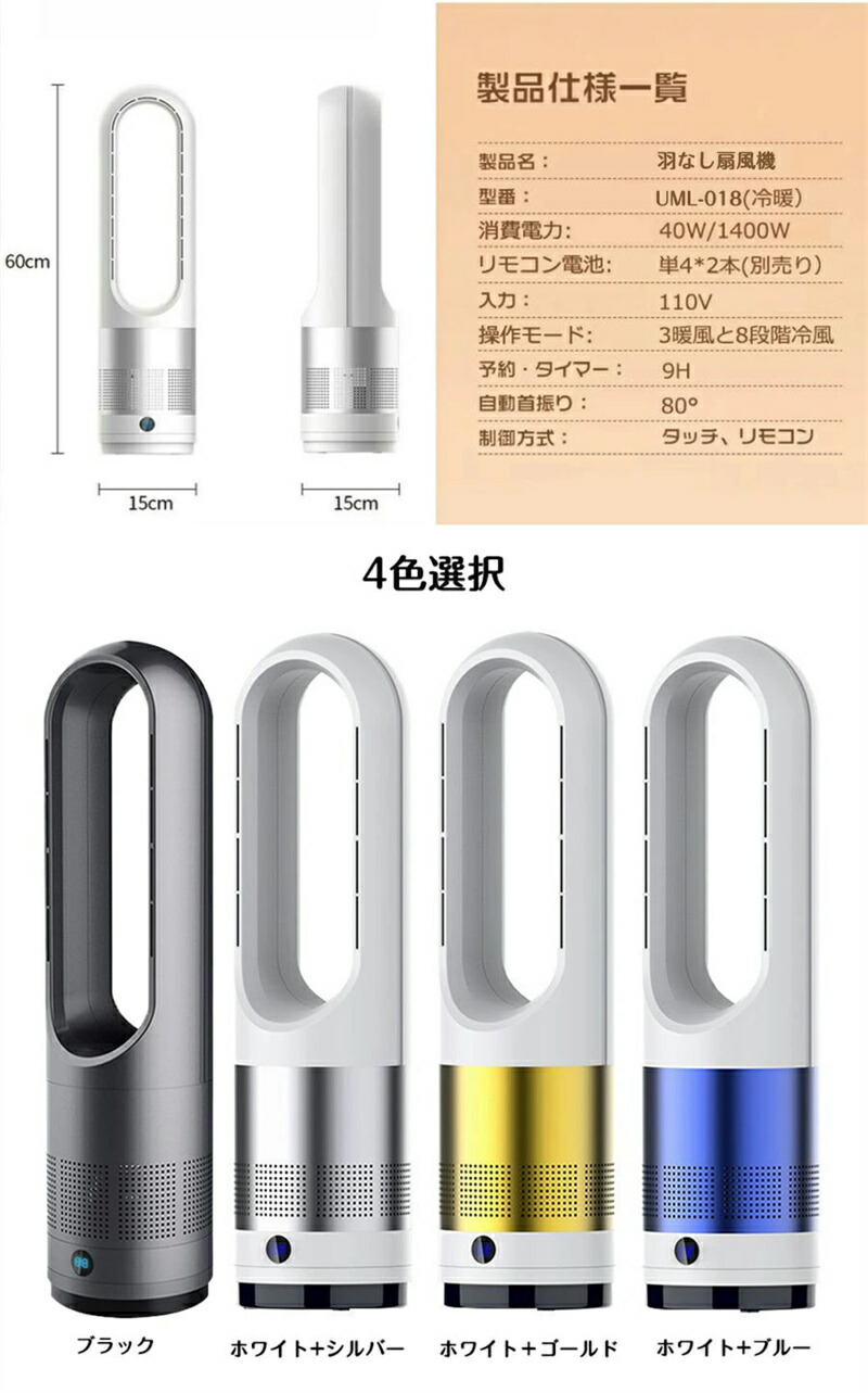 羽なし扇風機 温風機 冷暖タイプ スリ ブラック ホワイト+シルバー ホワイト+ゴールド ホワイト+ブルー 冷暖タイプ 冷風のみ