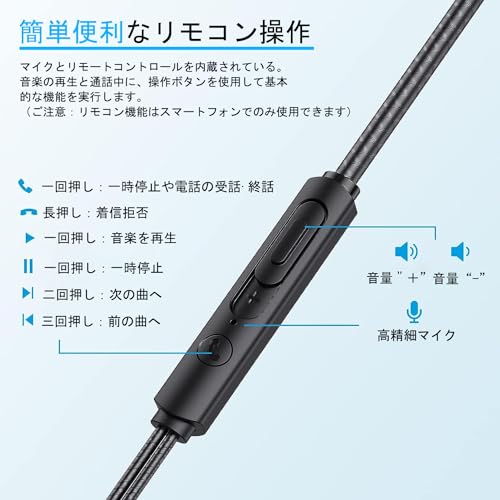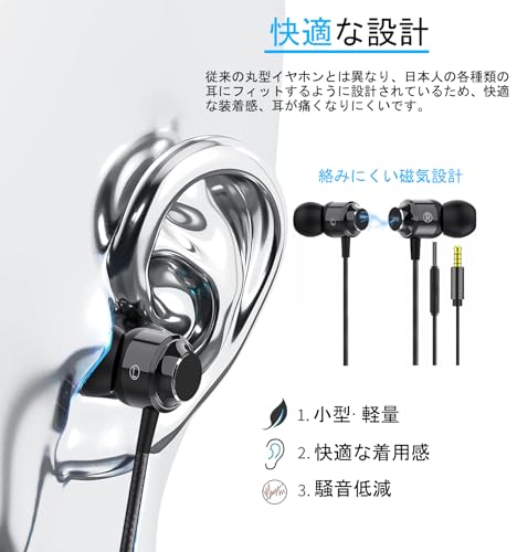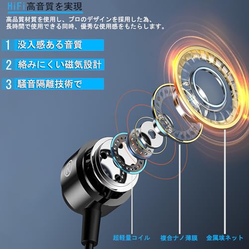 イヤホン 有線 イヤフォン マイク付き 磁気設計 絡み防止 HiFi音質 重低音 快適な装着感 高遮音性 音漏れ防止 リモコン付き 通話対応 ステレオイヤフォン 音量調整 ヘッドホン インナーイヤー型