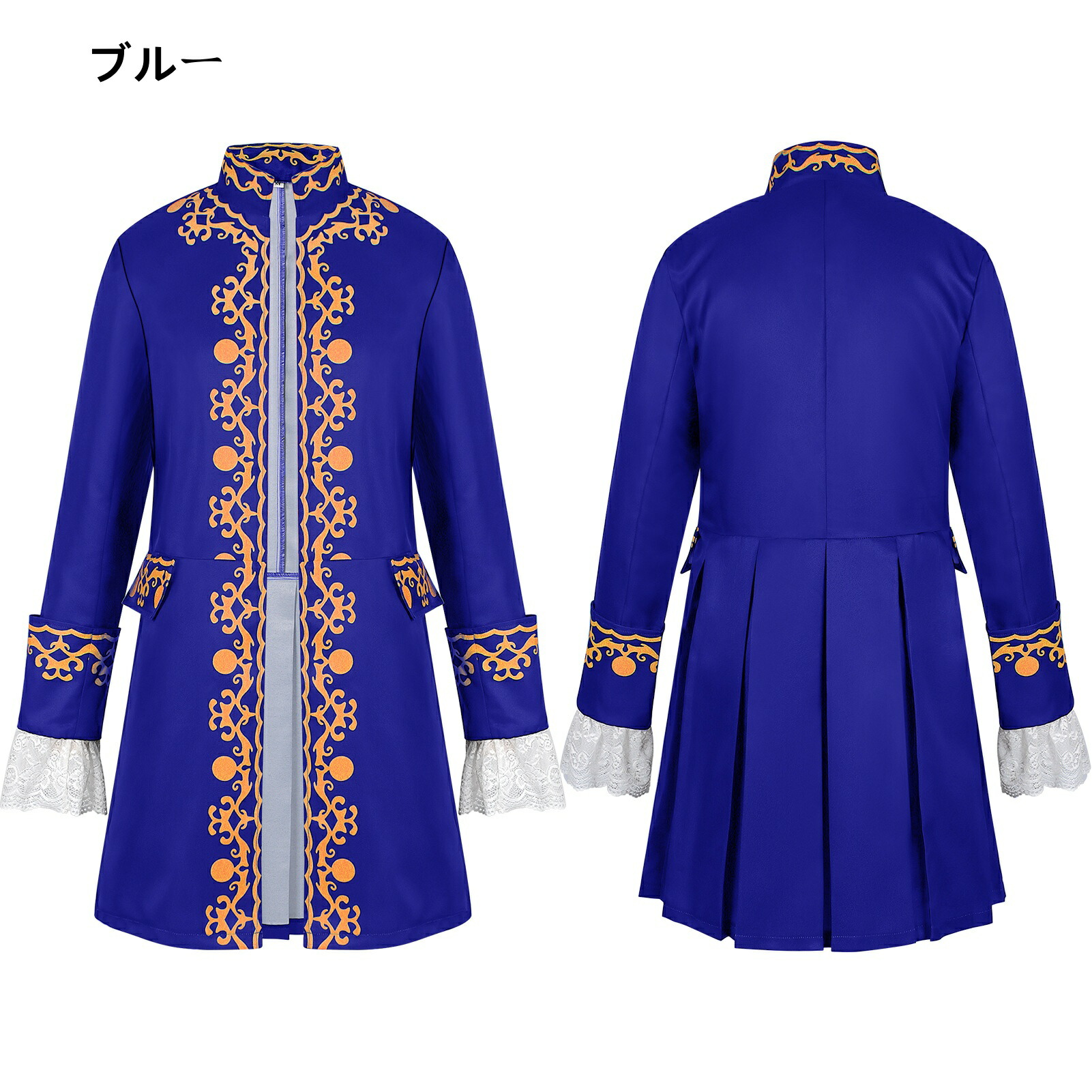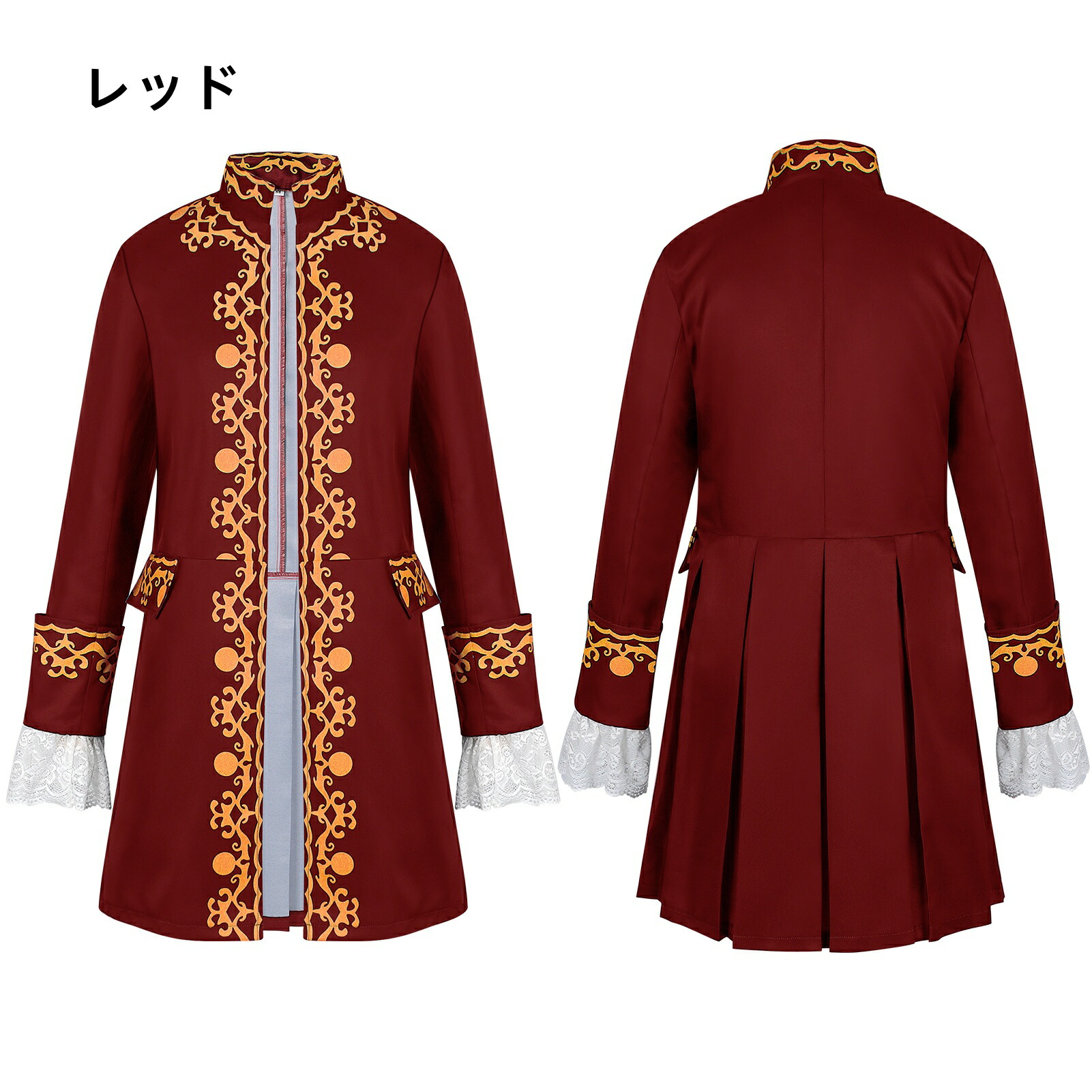 メンズジャケット 大人用 舞台衣装 コスプレ ロングジャケット レース袖 フリル裾 軍事制服 立襟 無地 欧風 ヨーロッパ風 王子様 貴族 ステージ衣装 コスチューム パーティー 舞台劇 ハロウィン