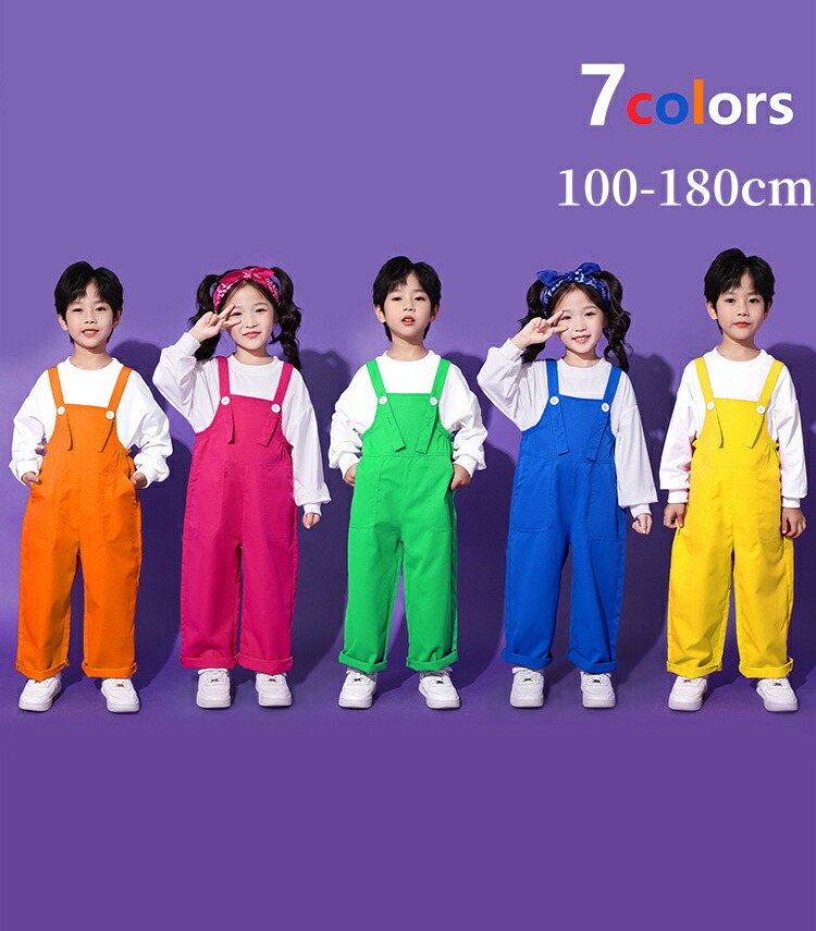 子供服 サロペット ダンス 衣装 キッ キッズ ボトムス パンツ 新作 イエロー ピンク レッド ブルー パープル グリーン オレンジ サロペット 上下セット 3点セット 4点セット