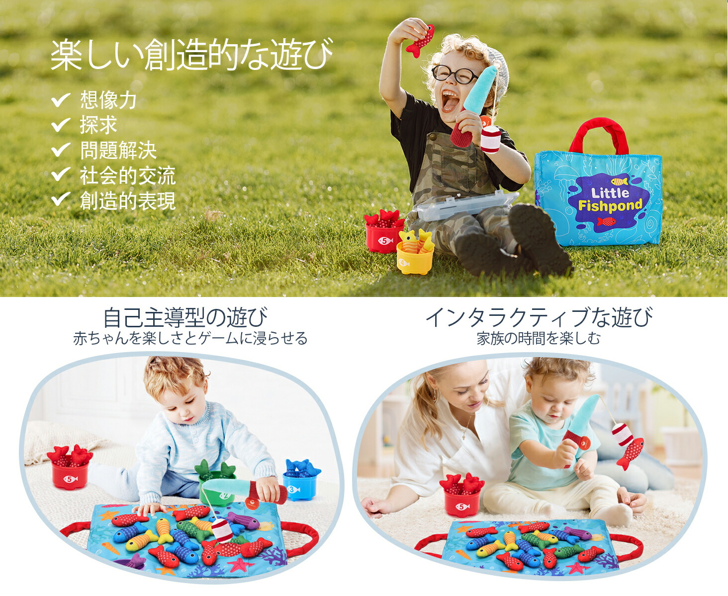 モンテッソーリ教育の理念に基づき設計された布製釣りおもちゃは、楽しく学べる知育玩具です。釣りゲームを通じて、お子さまが色や数字、分類を学びながら、遊びの中で自然に理解を深められます。さまざまなサイズのスタッキングカップとカラフルな魚で、大小の認識や簡単な足し算 引き算などの認知スキルを身につけることができます。