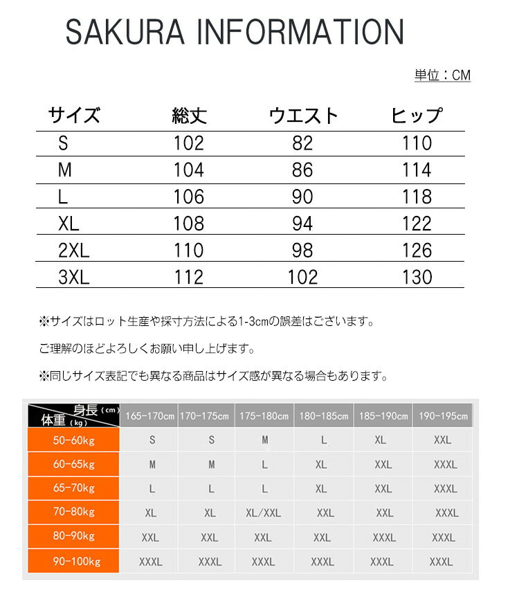 S/M/L/XL(LL)/2XL(3L)/3XL(4L)サイズ表にご参考まで