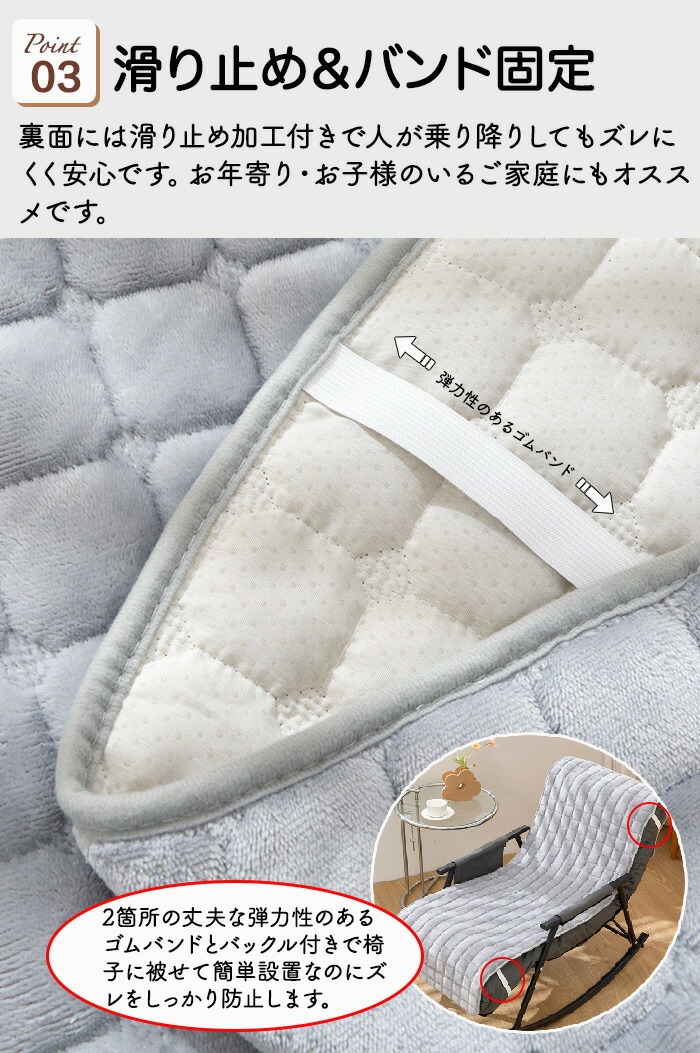 商品名:チェアカバー 椅子カバー 座椅子カバー あったか 背もたれ 冬 ストレッチ 大きめ フランネル ポコポコ 固定バンド付き 洗える かけるだけ 座面 背付き椅子 滑り止め クッション キルトパッド 北欧 椅子シート シート 模様替え 弾力ゴム付き フィット 新生活 ギフト 簡単取付 【シンプルなデザイン】シンプルなデザインでどんなお部屋にも合わせやすいデザインです。お部屋の雰囲気を損ねない見た目です!【簡単に取付】簡単取付で手間要らず!時間もかからない!バックル固定でずれにくい!安心して座ることができます。【洗濯可能】自宅で洗濯可能だから汚れても安心です。【ペット・子供のいるご家庭にもオススメ】ペットや子供の食べこぼし・落書きなどから大切な家具を守ってくれます。