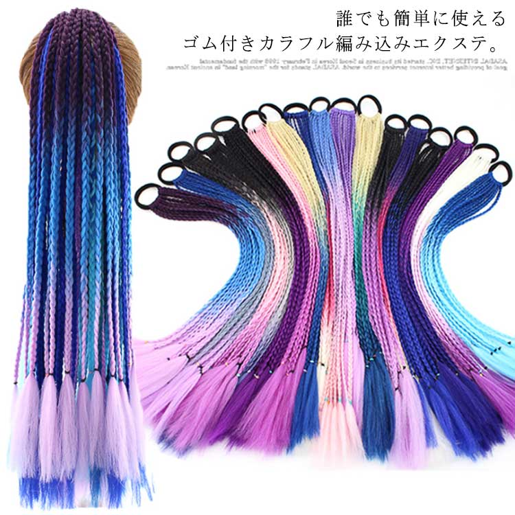 かんたん装着 ゴム付き 三つ編み エクステ カラフル編み込み ウィッグ ポニーテール メッシュ ドレッドヘア つけ毛 ダンス 発表会 フェス エクステンション 仮装 パーティー コスプレ