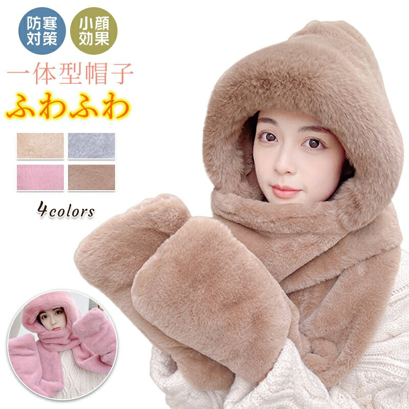 暖か ふわふわ 秋冬 帽子 マフラー 手袋 一体型 フード付マフラー スカーフ 厚手 ネックウォーマー かわいい 小顔効果 もこもこ 超可愛い ファー ぬくぬく 防寒 アウトドア あったか