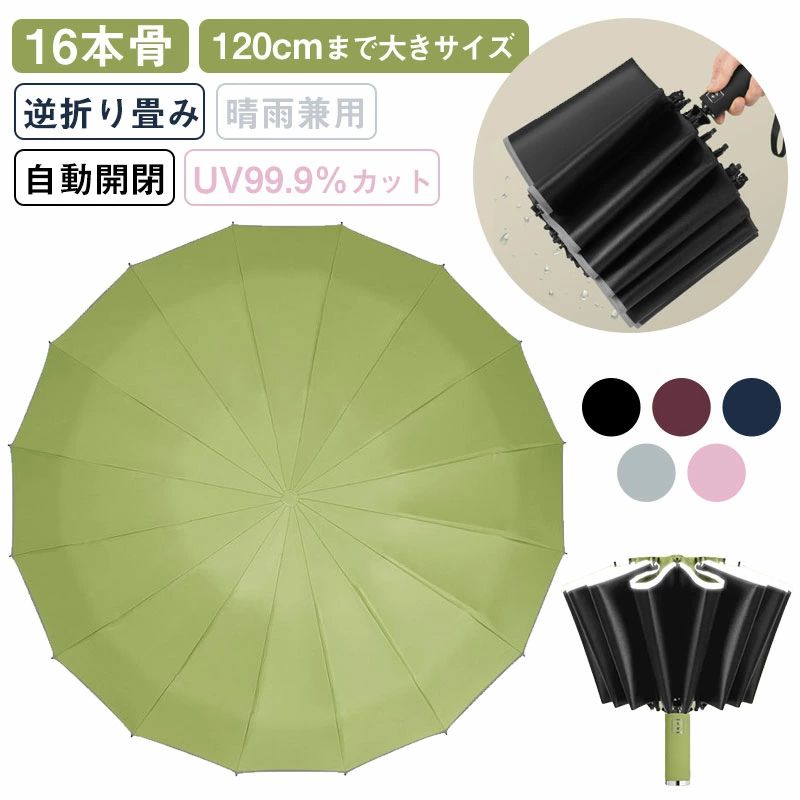 傘 16本骨 自動開閉 逆折 晴雨兼用 完全遮光 軽量 三段階折り畳み 120CM大きサイズ レディース 耐風 折りたたみ傘 耐強風 メンズ