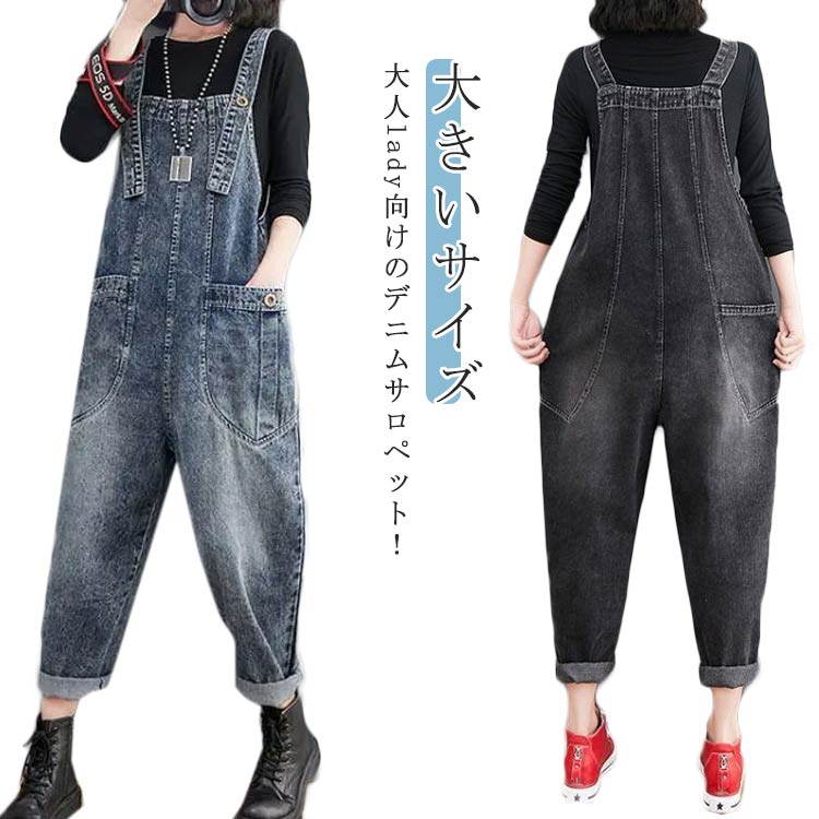 デニムサロペット パンツ オールインワン レディース サルエルパンツ オーバーオール 春秋冬 ワイド ロング 大きいサイズ カジュアル 大人 ゆったり