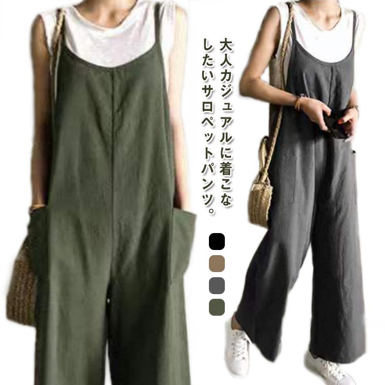 サロペット レディース オールインワン つなぎ ワイドパンツ ノースリーブ 大きいサイズ 体型カバー 大人 カジュアル きれいめ 綿混 ナチュラル ゆったり 春 秋 40代 50代 夏