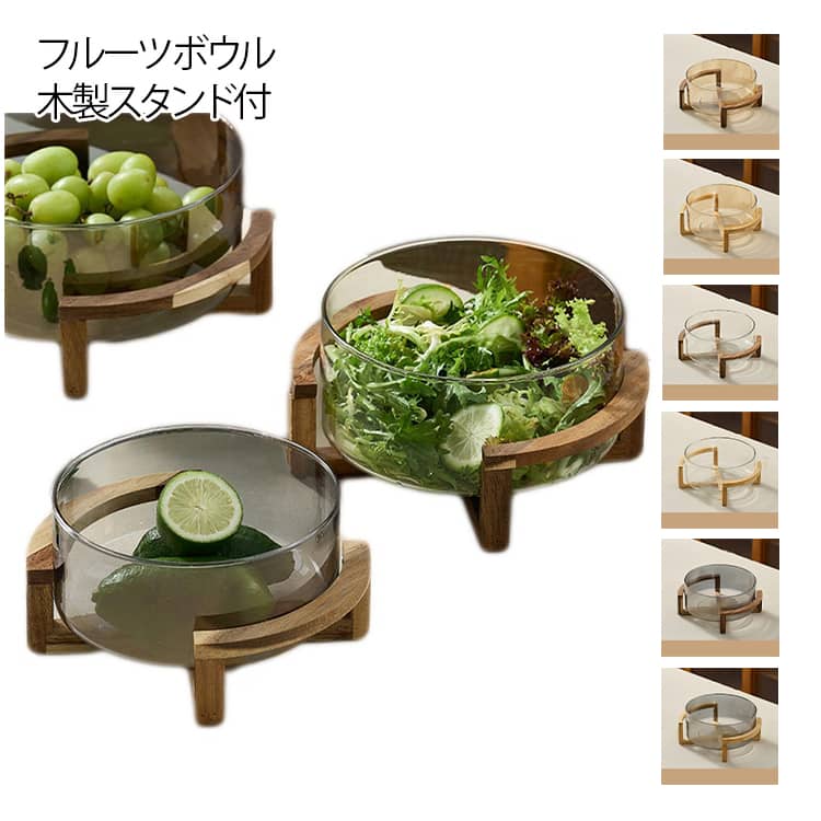 ガラスボウル フルーツボウル サラダボウル シリアルボウル 木製スタンド付 カフェ風 北欧 シンプル おしゃれ おうちカフェ 家庭用 ビュッフェ ホテルフロント 受付菓子