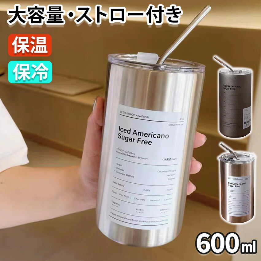 タンブラー 保温 保冷 蓋付き こぼれない ストロー付き 大容量 おしゃれ 持ち運び 水筒 真空断熱 コップ 600ml 二重構造 オフィス マグカップ ステンレス 韓国 マグ 直 コーヒータンブラー