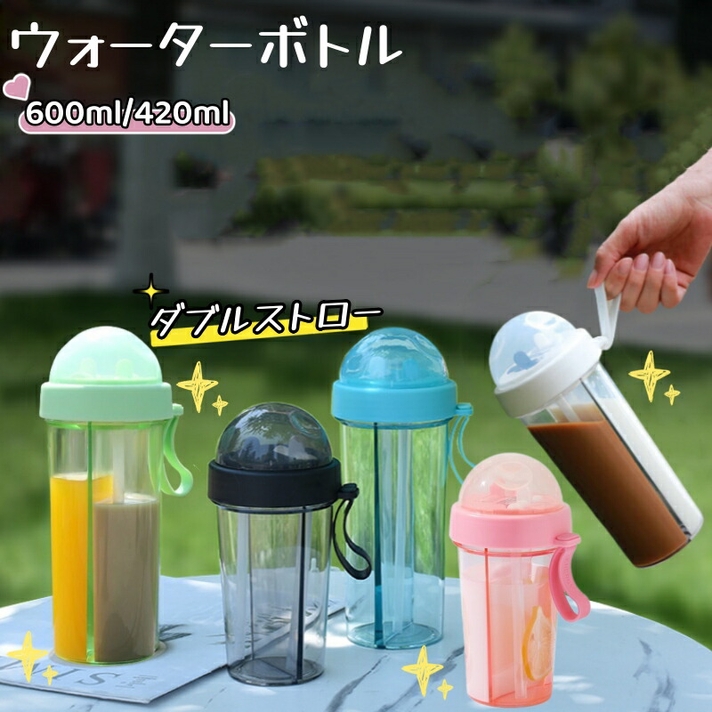 ウォーターボトル デュアル 600 420 -20~110℃ 2種類の飲み物 ストロー 水分補給 食品グレード 携帯便利 漏れ防止