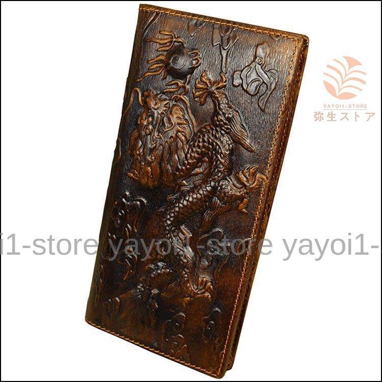 長財布 本革 小銭入れ付き メンズ 竜柄 メッシュレザー 二つ折り財布 ウォレット 携帯収納 ブラウン スマホ対応 プレゼント カード収納豊富