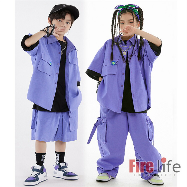 キッズダンス衣装 セットアップ 派手 ヒップホップ ダンス 衣装 子供服 紫 ジャケット カーゴパンツ Tシャツ 半袖 長袖 長パンツ ハーフパンツ 練習服 演出服 ガールズ 男女兼用 jaz 舞台服