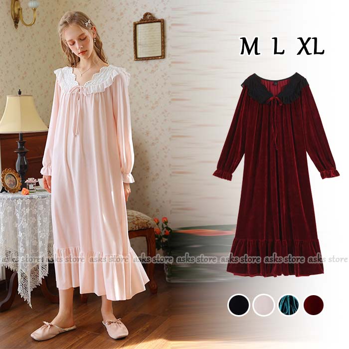 ネグリジェ レディース ルームウェア 秋 冬 パジャマ ロング丈 ワンピース 長袖 部屋着 ナイトウェア 宮廷風 天使風 ゆったり レディースファッション Vネック エレガント お姫様 着心 フリル裾