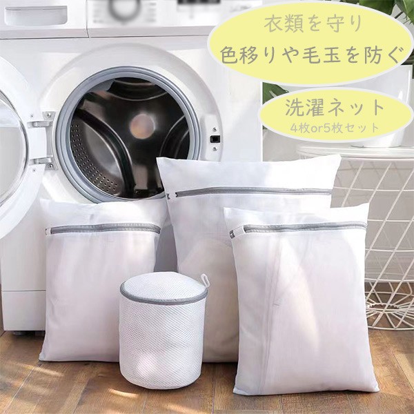 洗濯ネット 4枚or5枚セット 毛玉を防ぐ 色移りを防ぐ 家族用 収納袋 角型 平型 立体 白 ホワイト メッシュ ファスナー付き ブラジャー シャツ バスタオル m5m6 下着