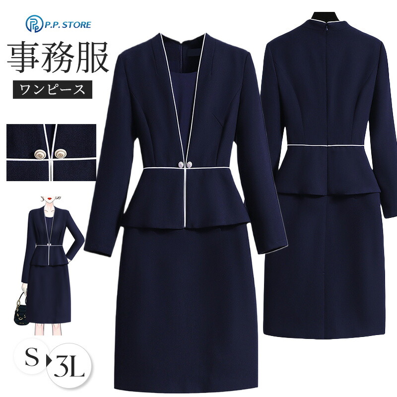 事務服 ワンピース レディース 制服 仕事服 大きいサイズ 通勤 オフィス 企業 きれいめ ネイビー