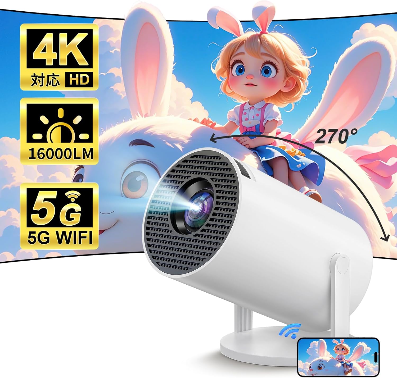 プロジェクター 小型 家庭用 4K対応 天井投影 210°回転 Netflix YouTubeb Android TV 1080P ホームシアター 5G wi-fi 天井 壁 コン 6
