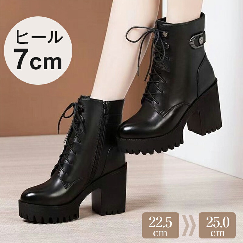 ブーツ レディース 厚底 ショートブーツ 編み上げ 痛くない ハイヒール 黒 7cmヒール 太ヒール 安定感 ファスナー ロリータ サイドファスナー ショート 靴 美脚 細見せ 身長ア 裏起毛