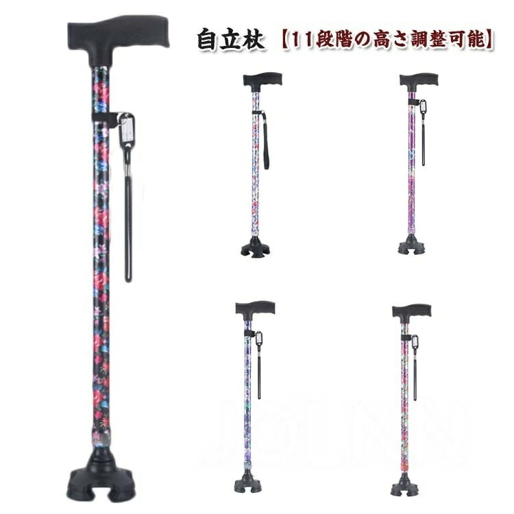 「手を離しても倒れない、安心の自立式。11段階の調整と華やかな花柄で、歩くのがもっと楽しくなるステッキ」
