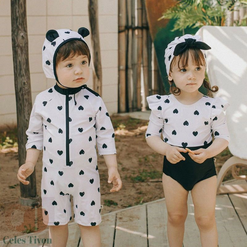 水着 男の子 女の子 キャップ付き ハート図案 男女兼用 オールインワン 長袖 ボーイズ boy ワンピース 子供用 こ ベビー水着