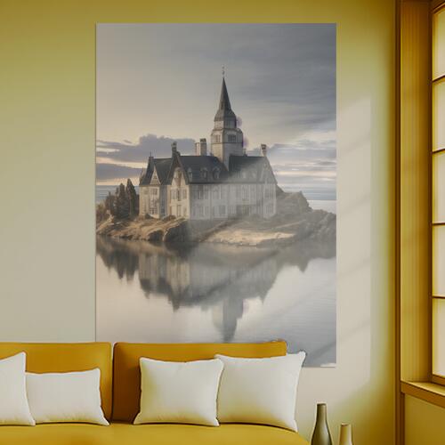 城 建物 水 反射 島 タペストリー 風景 リラックス 名画風 遠景 瞑想 大判 布製 壁飾り 巨大 壁掛け インテリア 大きい 撮影背景 グレー ベージュ 白 長方形