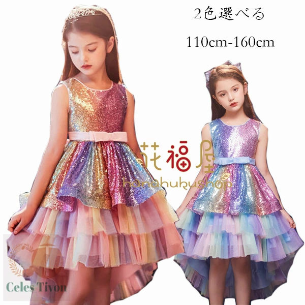子供ドレス 女の子 スパンコール ドレス タキシードドレス 虹色 キッズ 結婚式ドレス 発表会ドレス 前後丈 プリンセス 呼ばれ 演奏会 音楽会 110 130 140 150 120