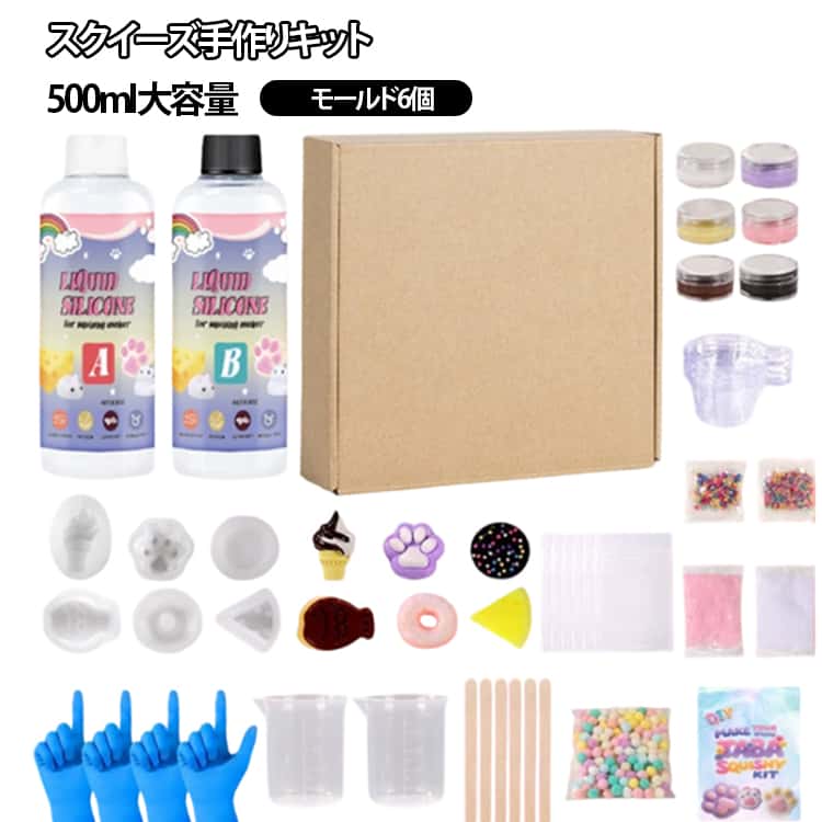 スクイーズ手作りキット 500ml モールド6個 キット DIY こども 子供 大人 モチモチ レジン アソート やみつき ストレス解消 グミ キッズ 肉球モールド フロッキングパウダー付き ソフト