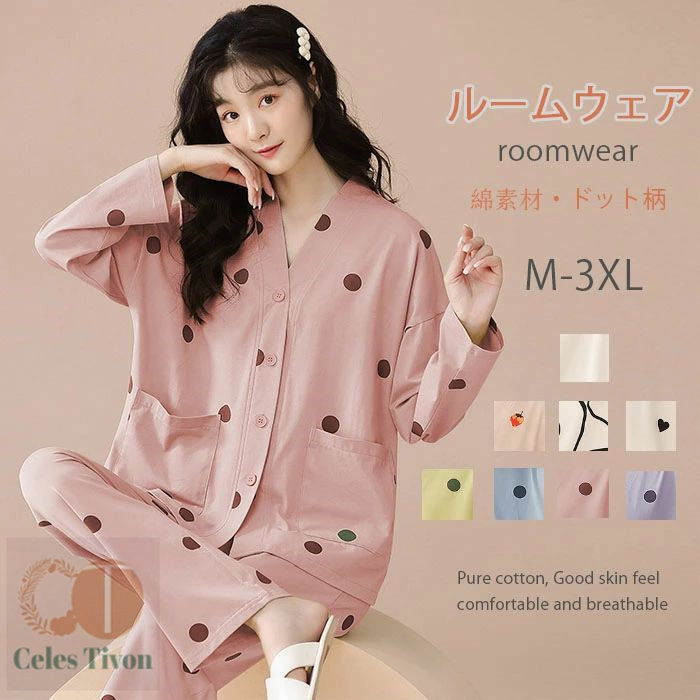 ルームウエア綿100%前開きドット柄水 レディース ナイトウェア ルームウェア ルームウェア 上下セット 人気 62070 62071 62072 62073 62074 62075 62076 62077 M L XL 2XL 3XL