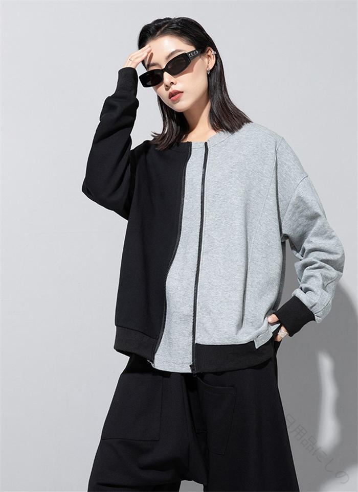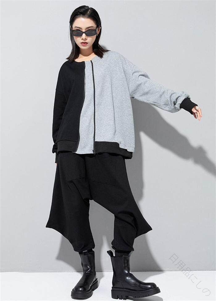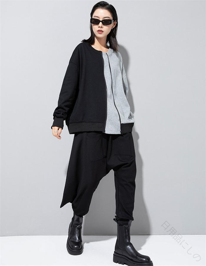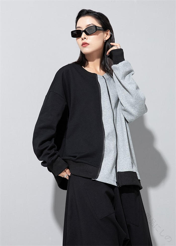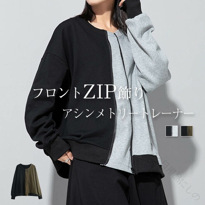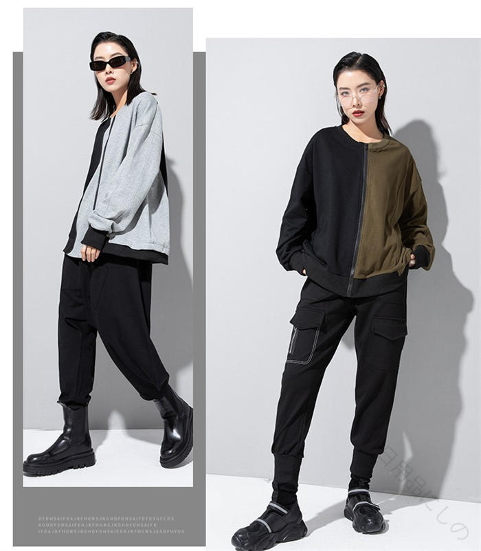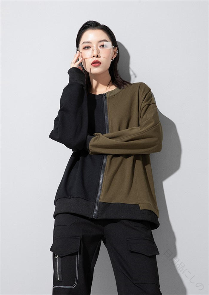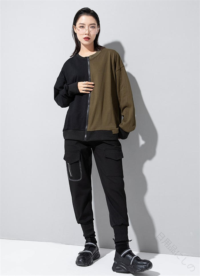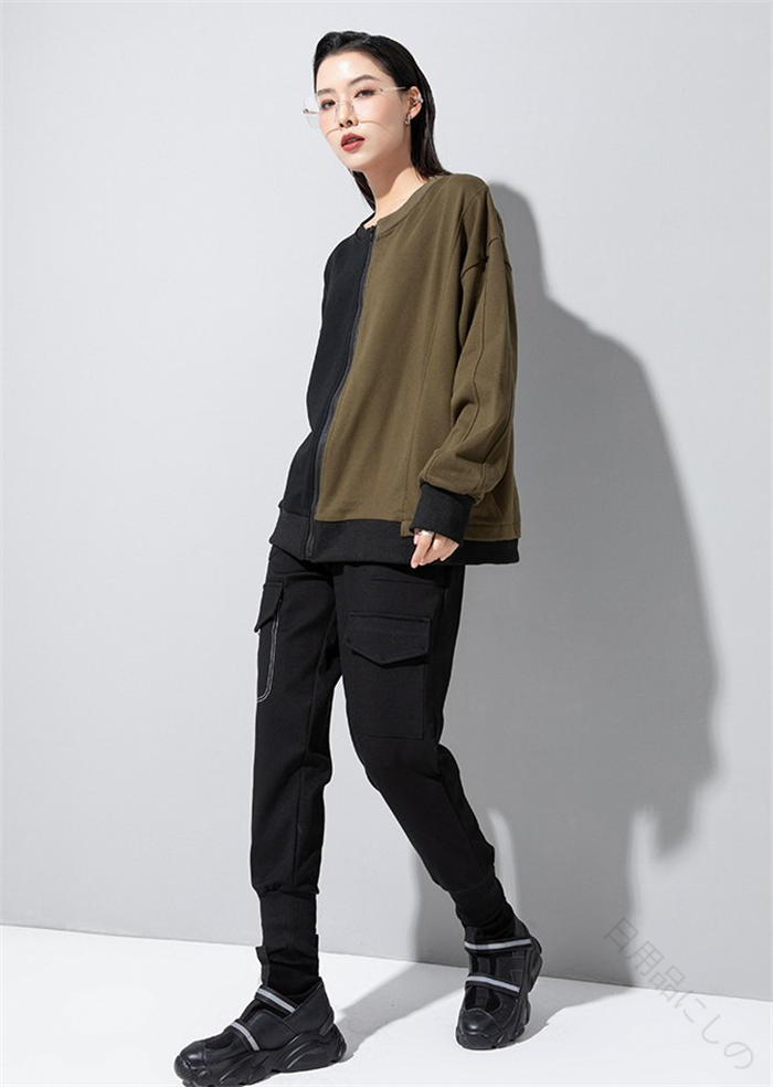 アシンメトリー トレーナー 秋 冬 春 トップス スウェット トレーナー 人気 黒×グレー 黒×カーキ