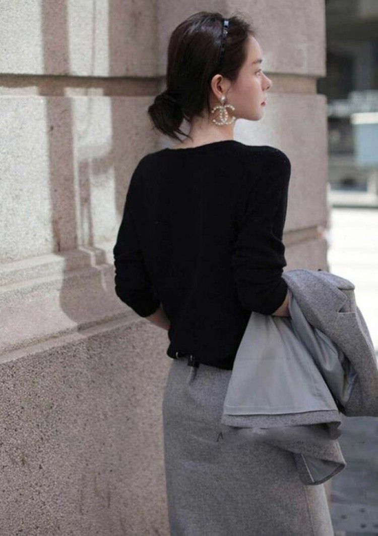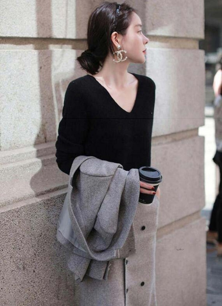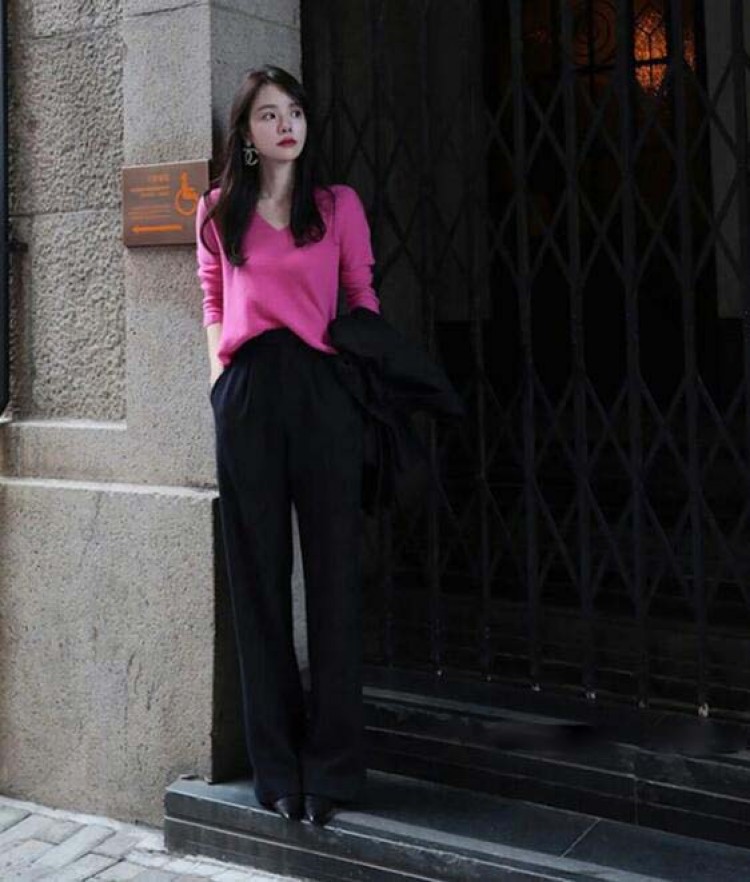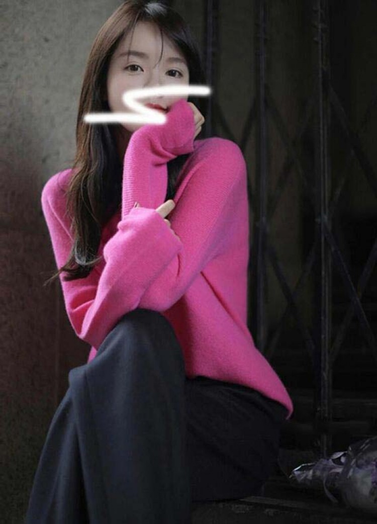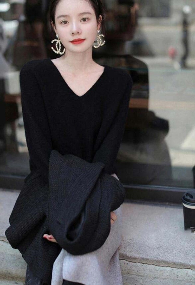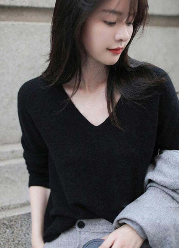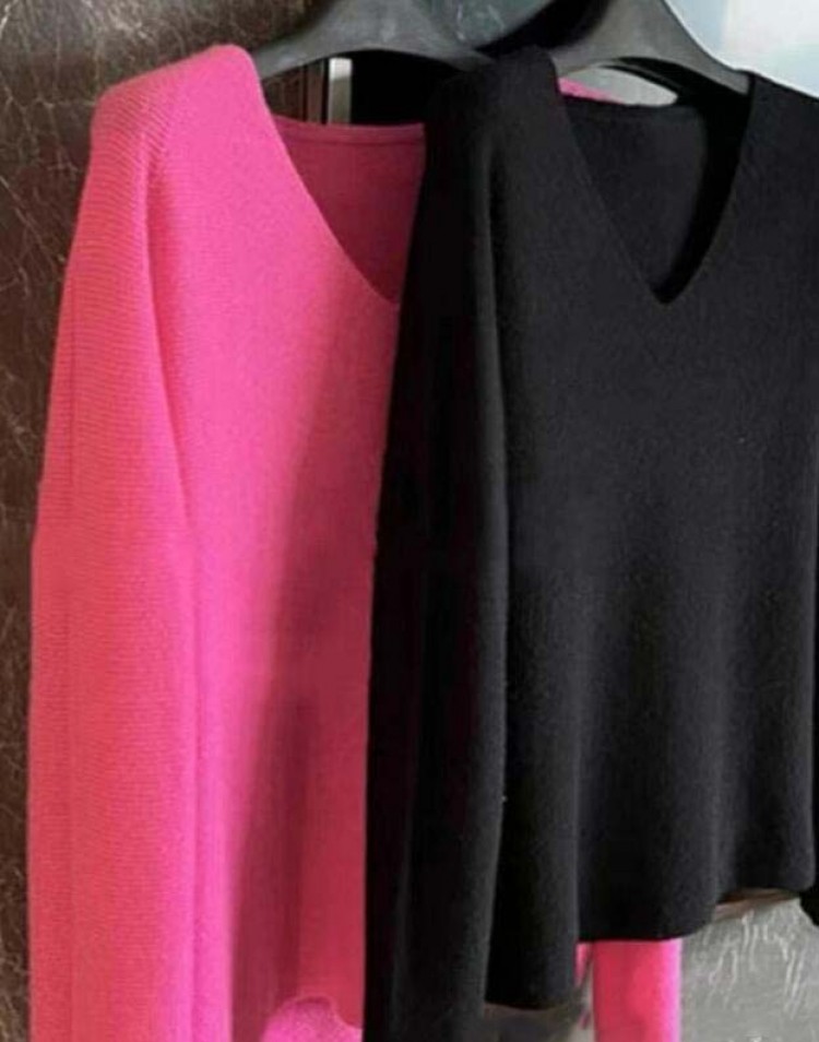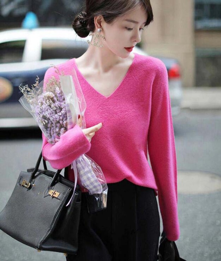 ニットトップス 長袖セーター Vネック ローズピンク ブラック