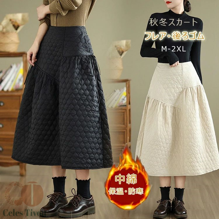 キルティングスカート フレア スカート レディース 秋冬 ウエストゴム ポケット付き ハイウェスト 可愛い あたたかい 中綿 キレイめ ロングスカート Aライン キルティング きれいめ フレアスカート