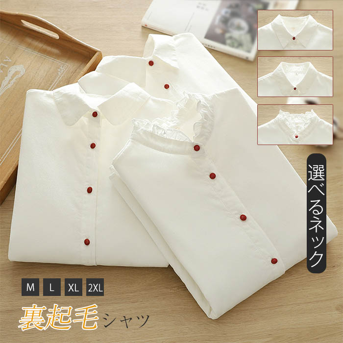 選べるネック: レギュラーカラー/フリルカラー/丸襟 裏起毛 シャツ 長袖 レディース 春秋 秋冬 綿 コットン 裏起毛シャツ シャツ トップス シャツブラウス 春 秋 冬 通勤 ゆったり 白