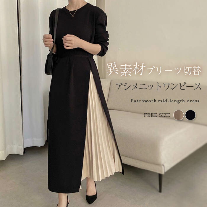 ワンピース 秋冬 きれいめ ニットワンピース 冬 アシメ サイドプリーツ 切り替え 異素材 ドッキング 長袖 ニット ロング丈 クルーネック ひも付き 無地 カジュアル 大人