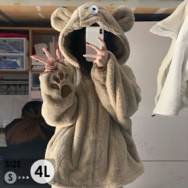 熊 ルームウェア もこもこ パジャマ 上下セット 大きいサイズ 冬用 長袖 フード付き 前開き 寝巻き 部屋着 暖かい あったか 着ぐるみ モコモコ 大人用 ふわふわ レディース 女性用 かわい 動物